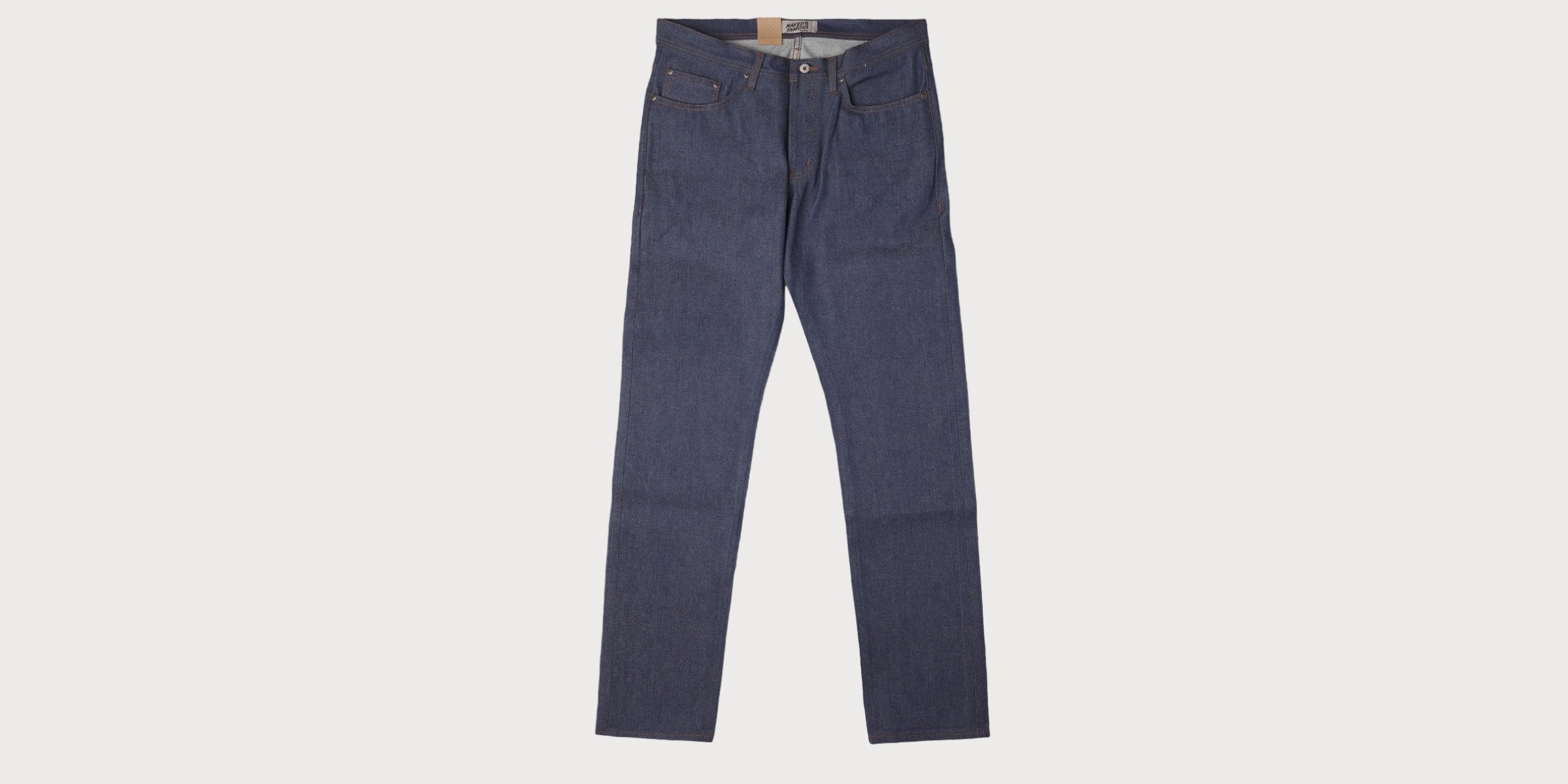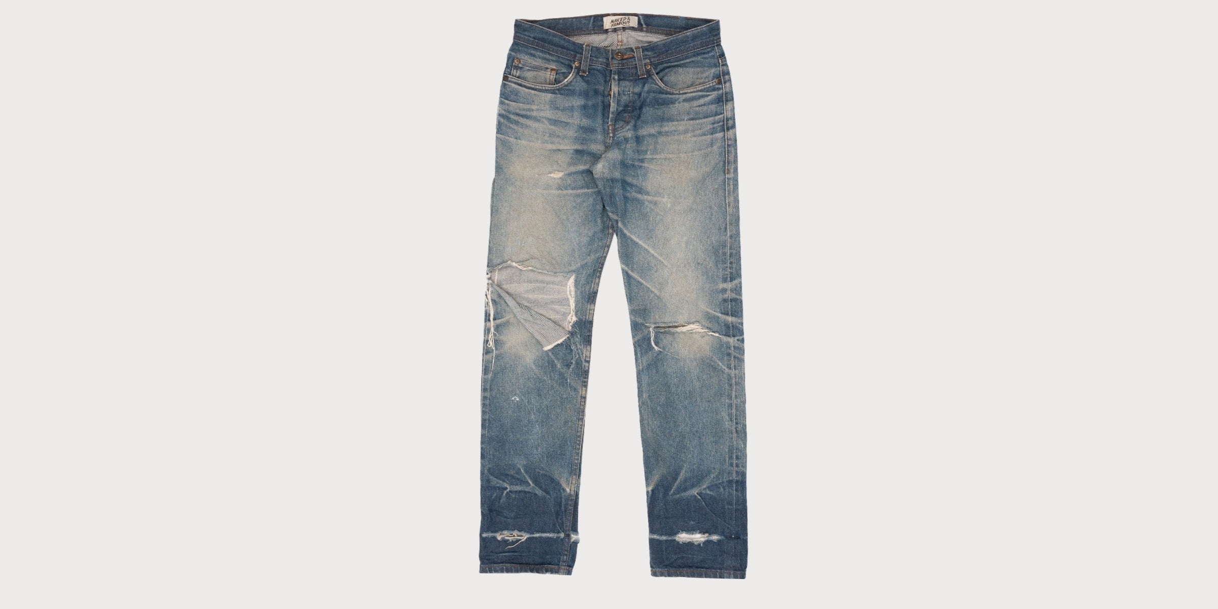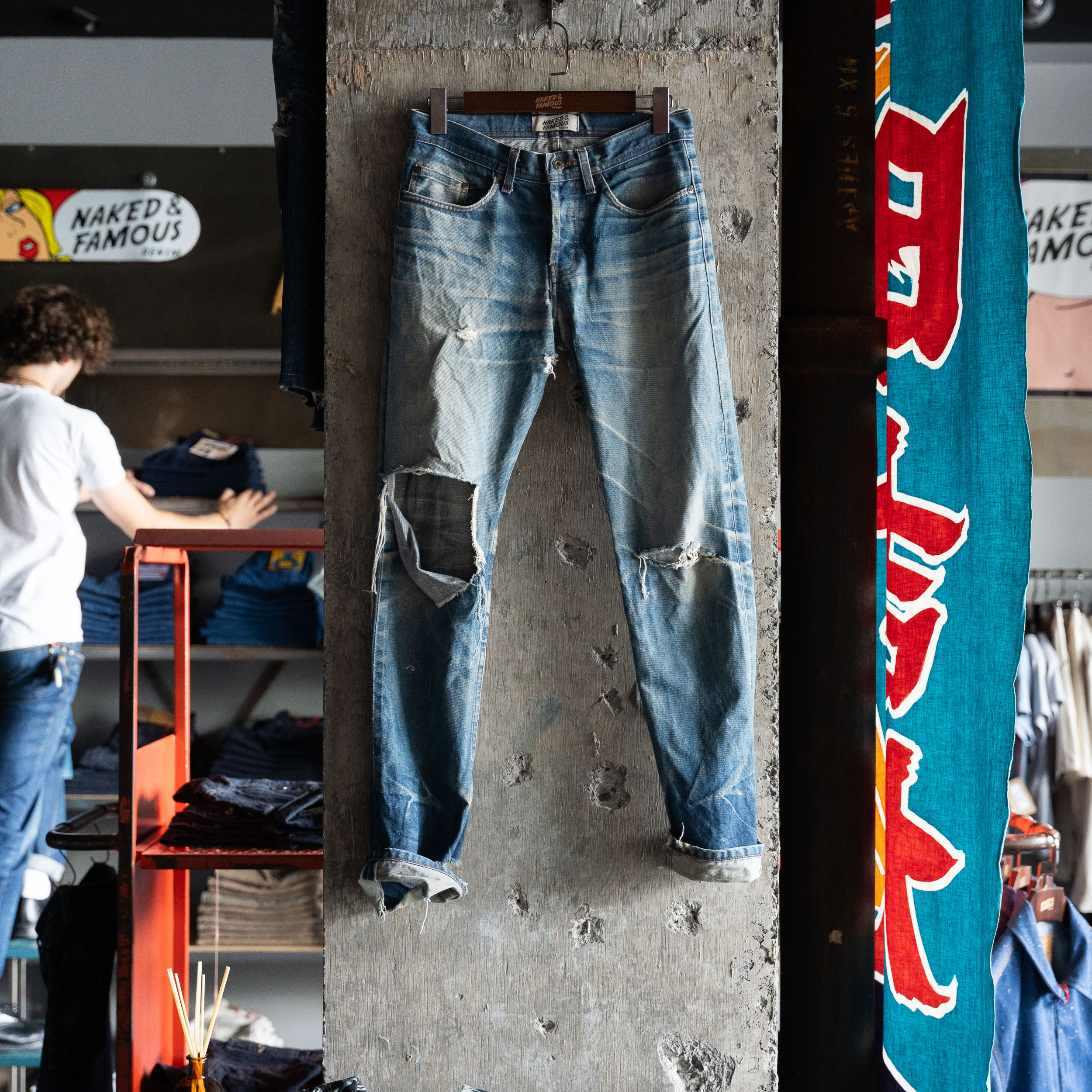 À gauche, un jean Weird Guy tout neuf en indigo naturel Selvedge ; à droite, le même après des mois d'usure. Ces décolorations ne sont pas préfabriquées en usine, elles sont le résultat du quotidien. Chaque jean développe ses propres "fades"; moustaches, nids d'abeilles et nuances, devenant ainsi le reflet de son propriétaire.
