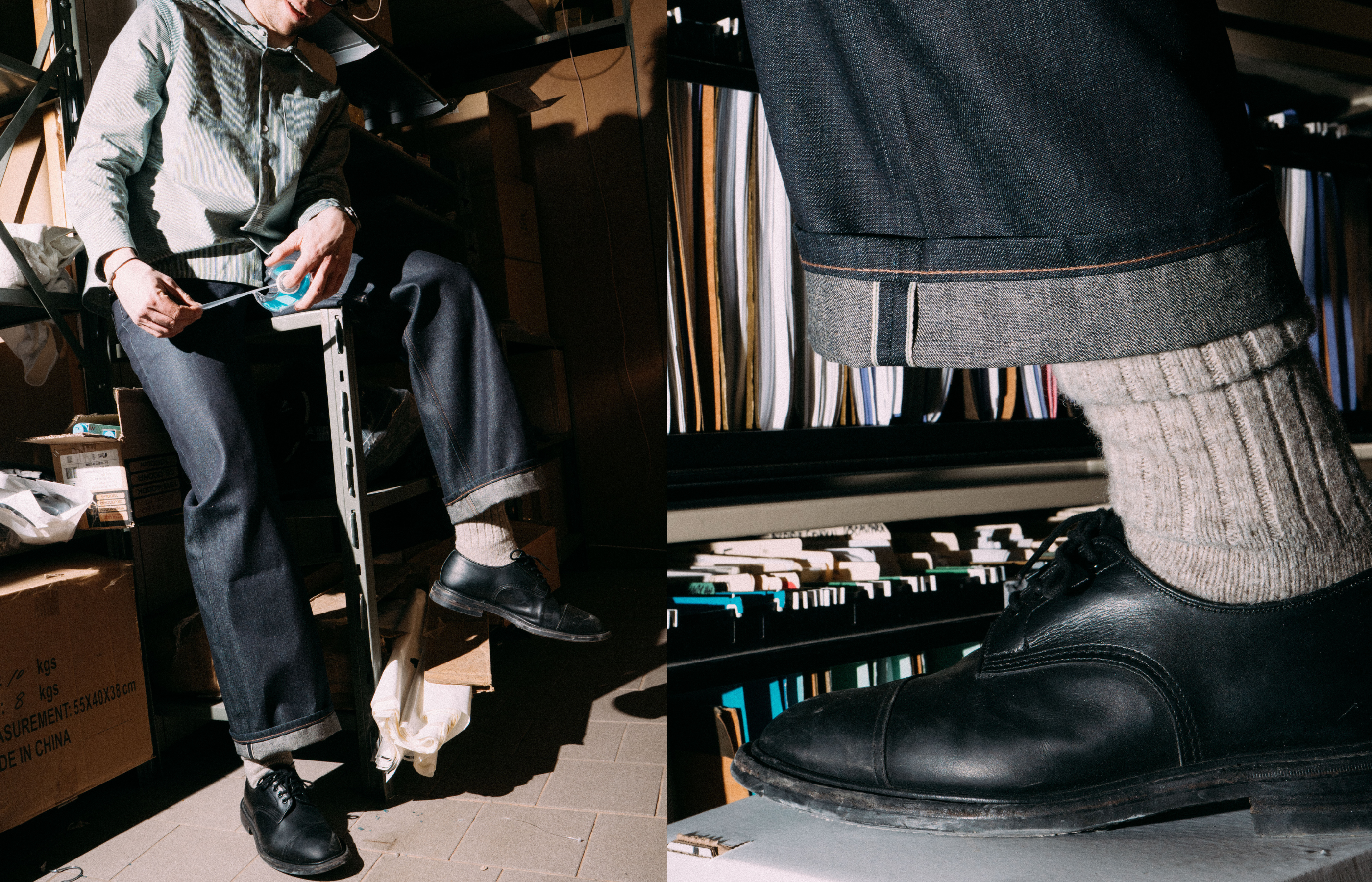 A brand new pair of Weird Guy in Natural Indigo Selvedge stands on the left; on the right, the same jeans after months of wear. These fades aren’t pre-made in a factory, they’re the result of daily life. Each pair develops its own whiskers, honeycombs, and shades, becoming a reflection of its owner.