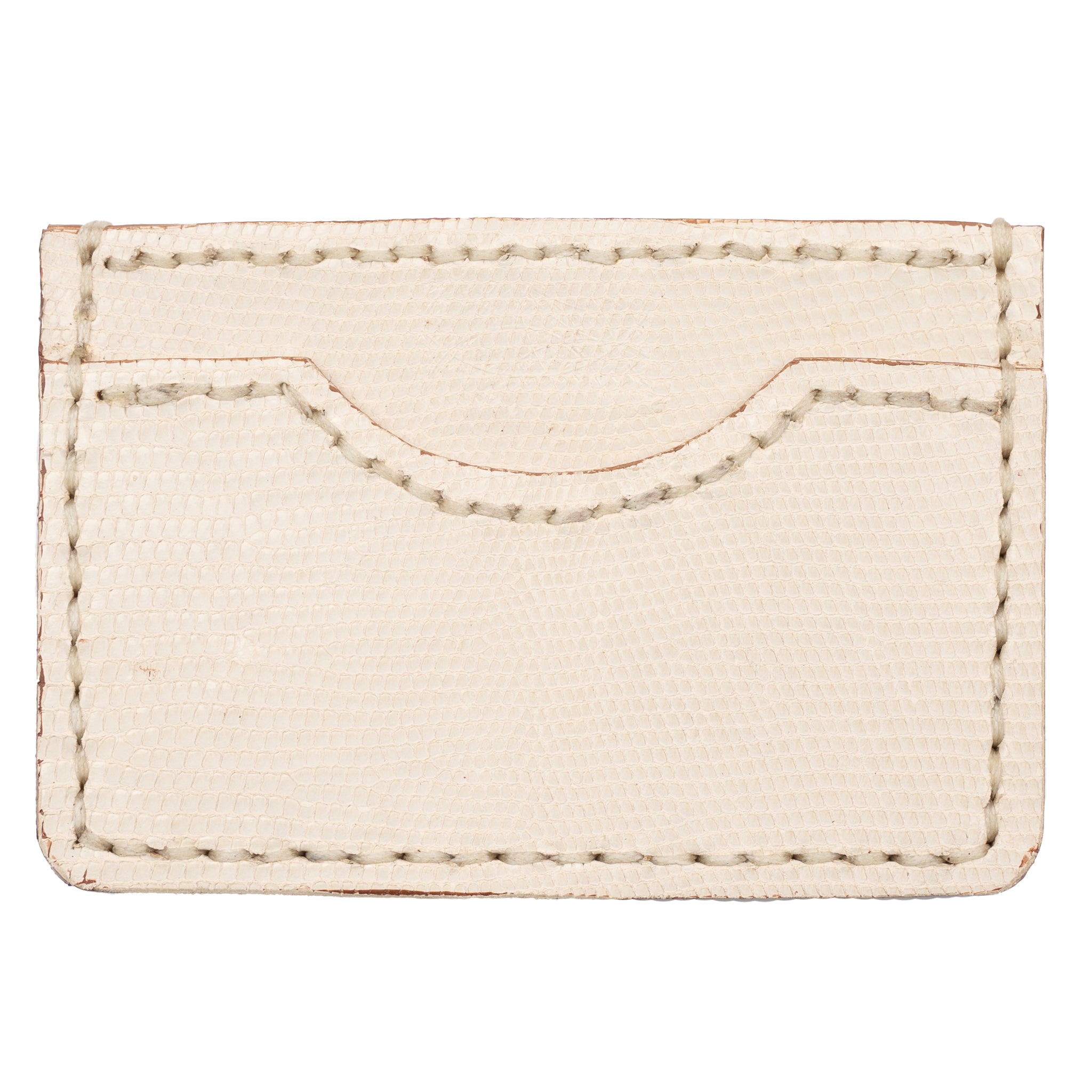 The Ivory Lizard is a dyed leather from lizard with a beautiful fine texture. The Card Case is a hand-cut, hand-awled, and hand stitched card holder.