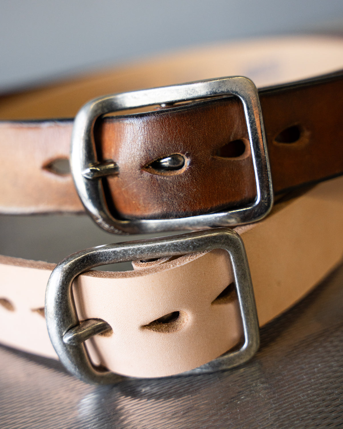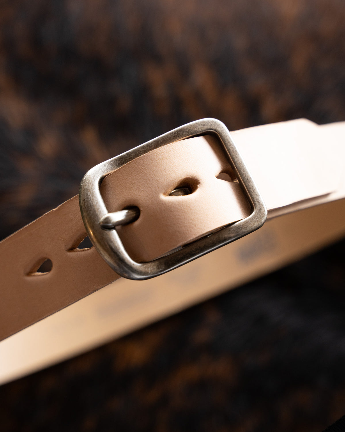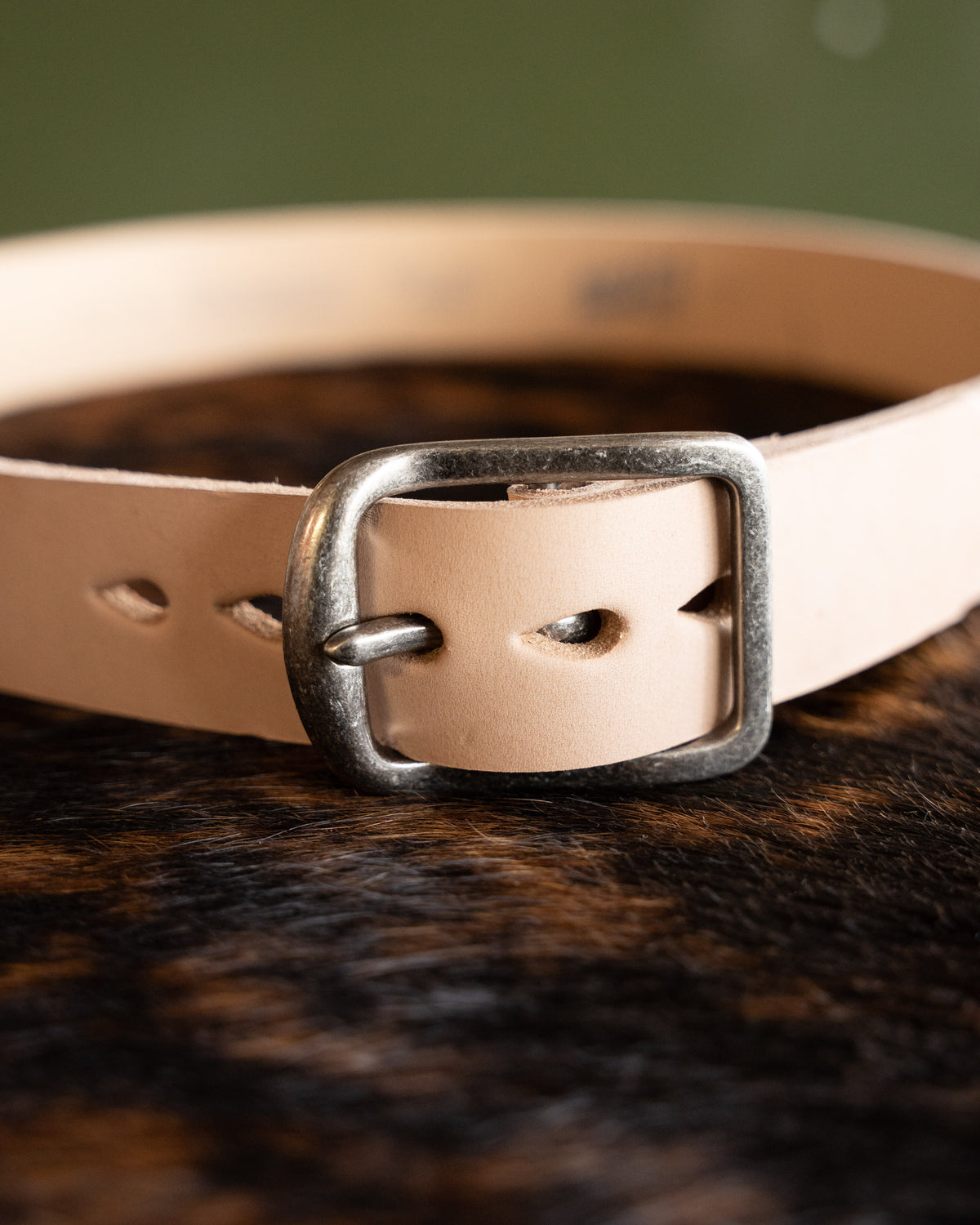The Bovine Leather Natural Tan is a super thick (up to 7mm) vegetable tanned leather that will age beautifully with wear. The Thick Belt is a 1.5-inch wide belt with a heavy duty brushed metal buckle.
