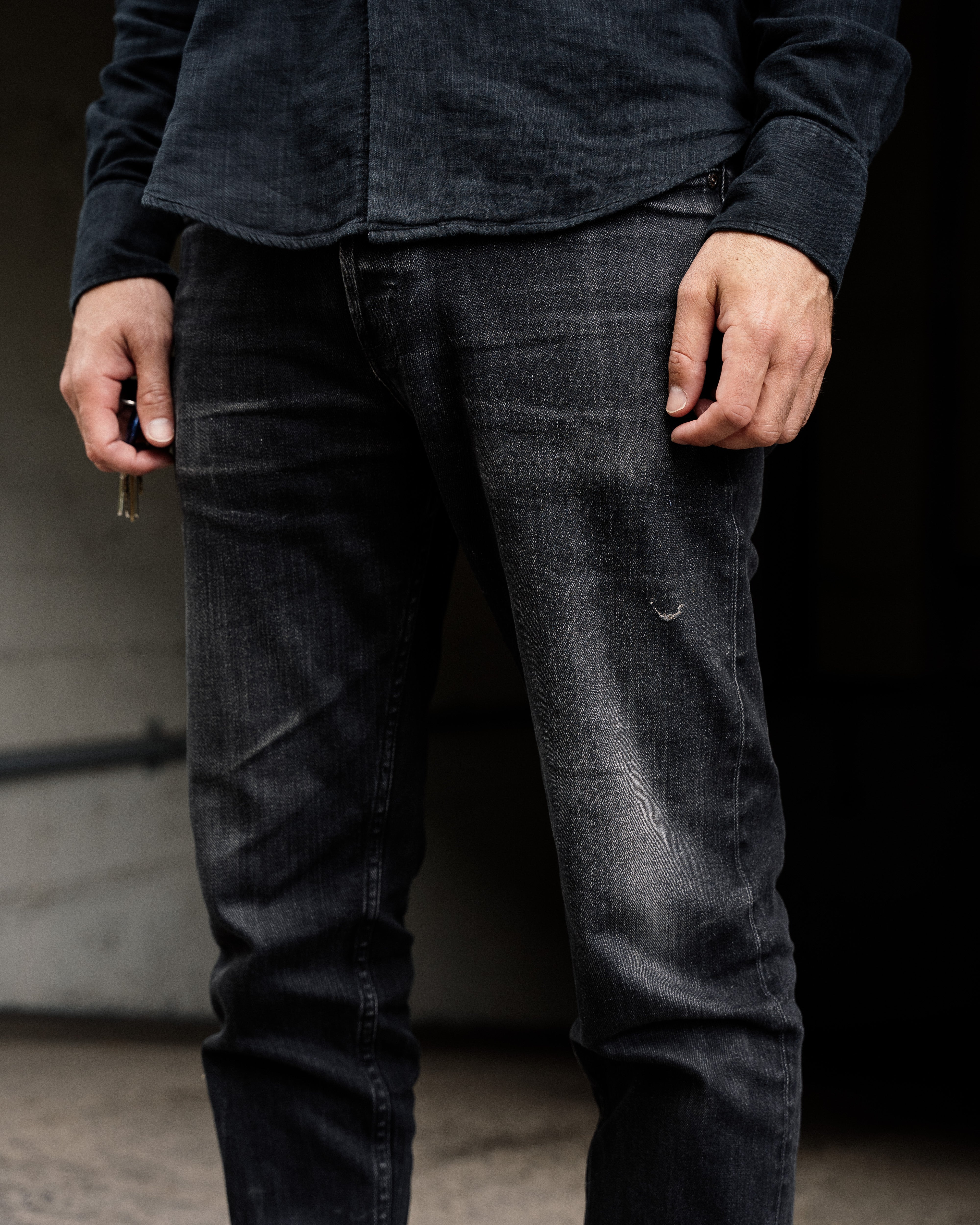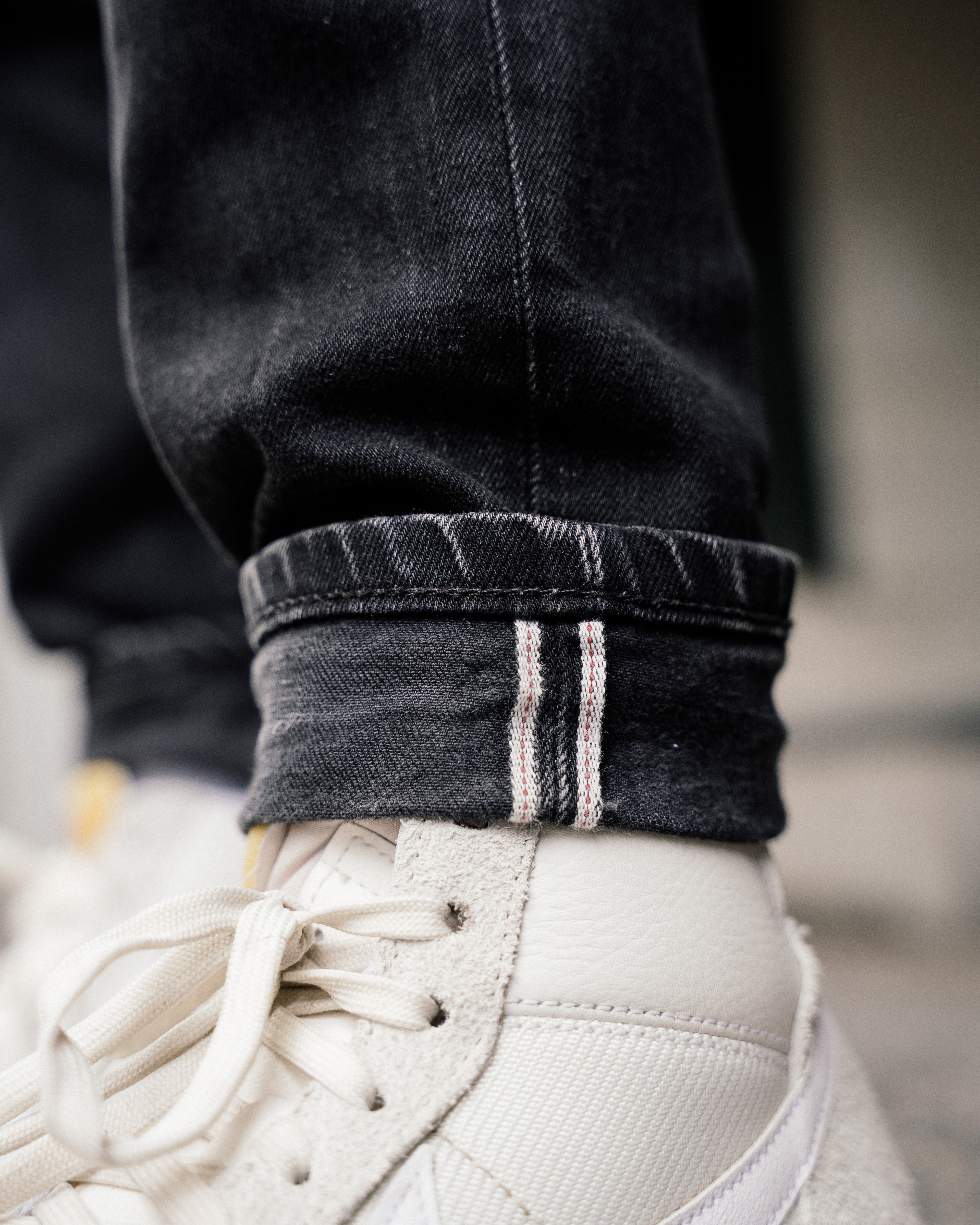 The Black Cobra Stretch Selvedge is a 12oz Japanese selvedge denim with a black warp and a black weft to create a pitch-black denim, the only flash of color comes from the red line selvedge ID. The standard weight fabric can be worn year-round, and the touch of stretch offers comfort and flexibility without compromising durability. Cut, sewn, built in Canada with black stitching, a black full grain leather patch, and mil-spec non-reflective black metal buttons and rivets. The Weird Guy is a standard tapered fit with a medium rise, a comfortable top block, and a taper from knee to hem.