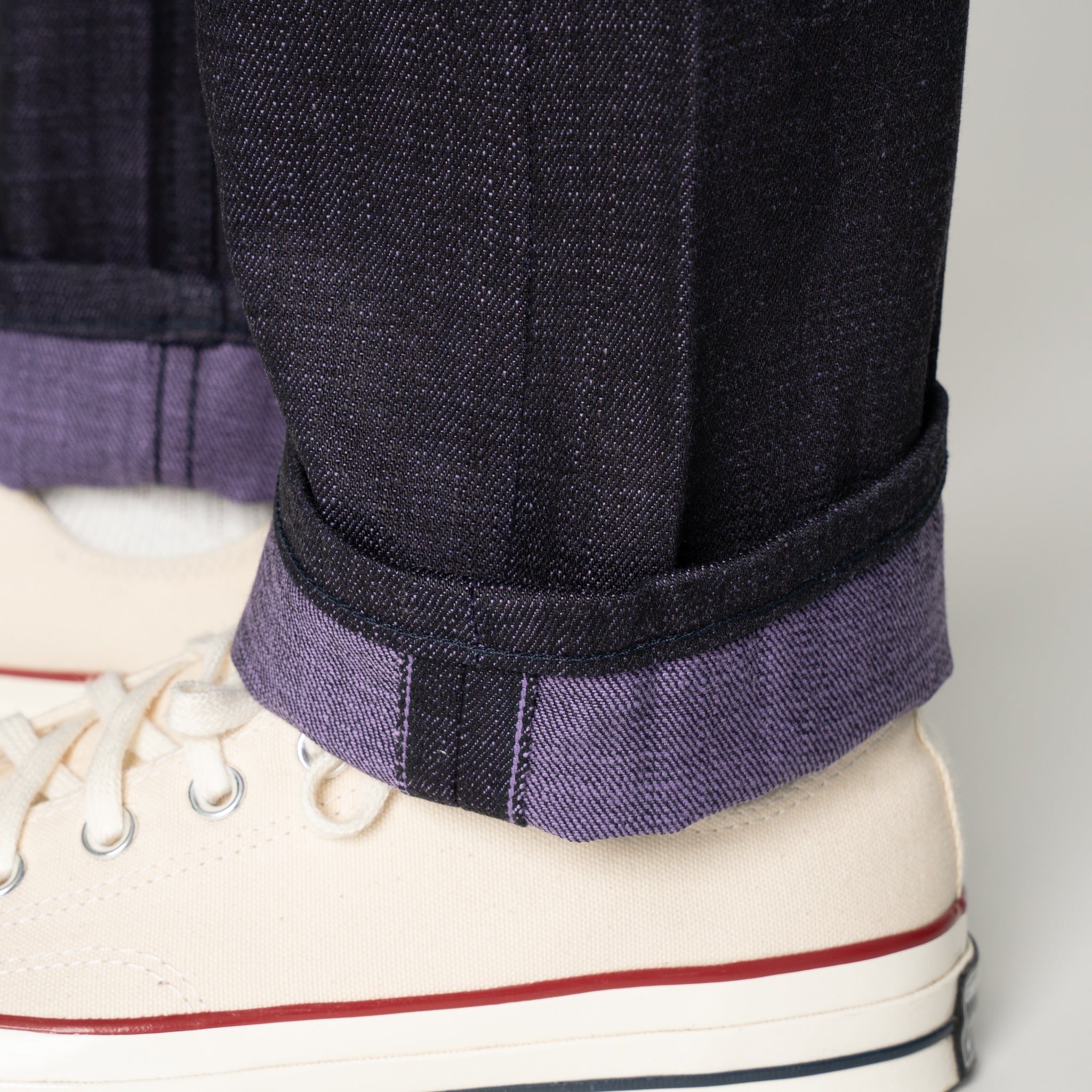 But it's not just the texture that'll turn heads. The purple weft color mischievously peeks through the twill lines of the front face of the fabric, like a vampire sneaking out at twilight. And to top it off, we've added a charming Purple selvedge ID for a touch of supernatural elegance.
